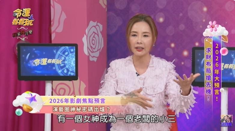 許聖梅日前上《命運好好玩》節目時,預言2026年將會出現大量醜聞,其中一則是某位女神級人物竟成為「老闆的小三」,而且據她了解,元配已經採取法律行動提起告訴。她認為若這則消息最終公開,絕對會成為2026年演藝圈的重磅炸彈。