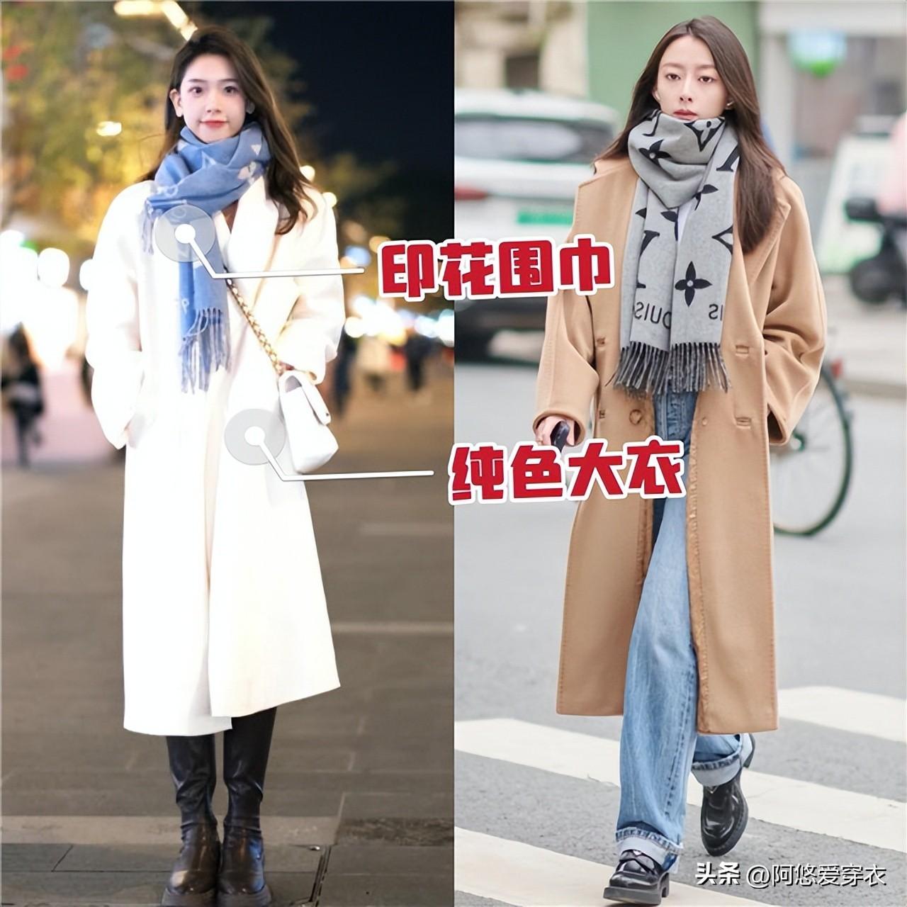 假如你在搭配的時候對於圍巾的選款和大衣的選款都沒什麼思路,你可以先去選擇大衣的款式,然後再根據大衣的風格去選擇合適的圍巾,這樣的話就可以避免隨意亂搭配而所帶來的老土感,像這種經典的純色大衣,無論是白色還是棕色都是很耐看的,再搭配上這種花紋大氣的印花圍巾,點綴效果很強,又不會顯得花哨。