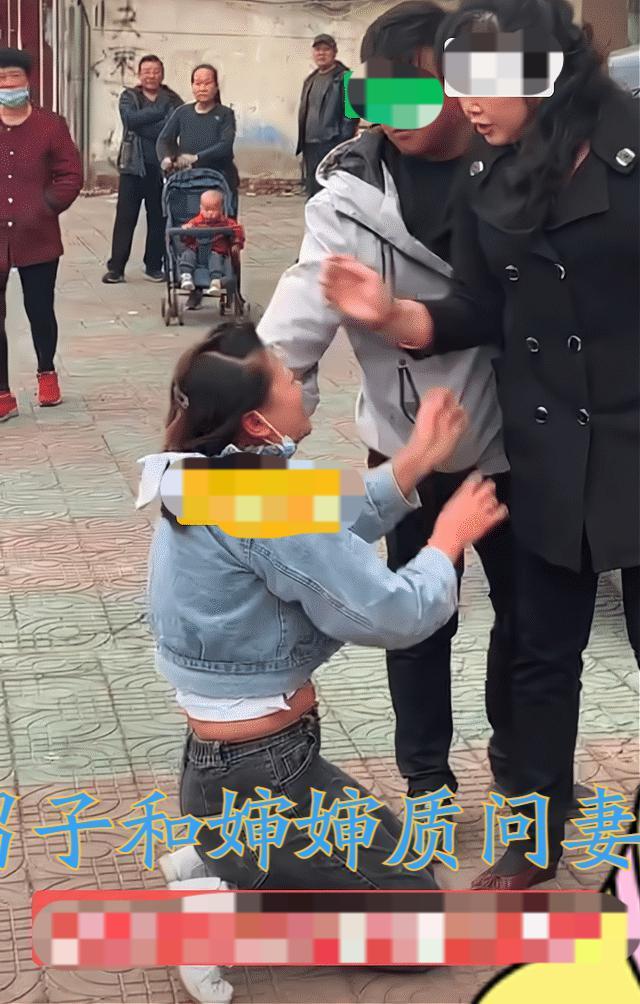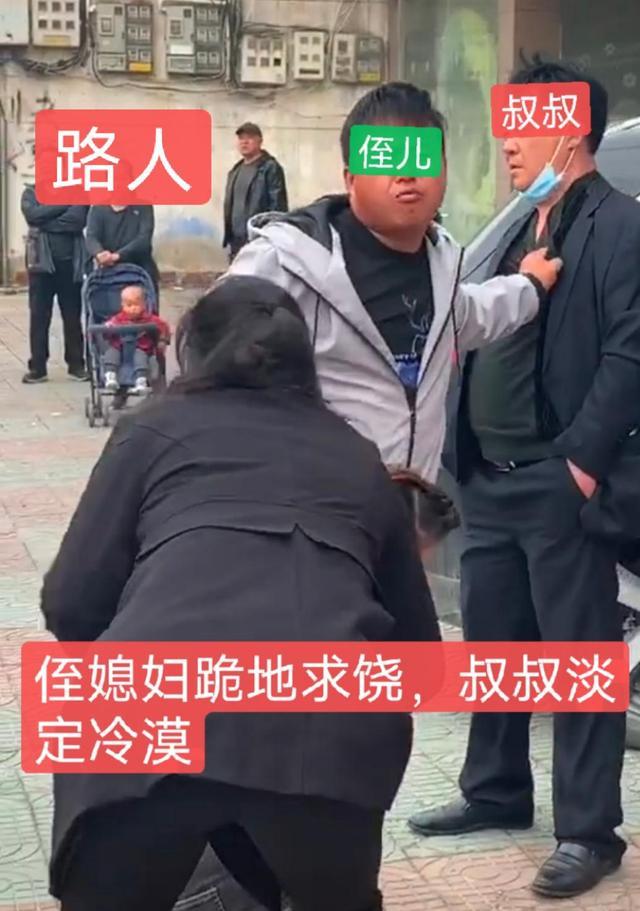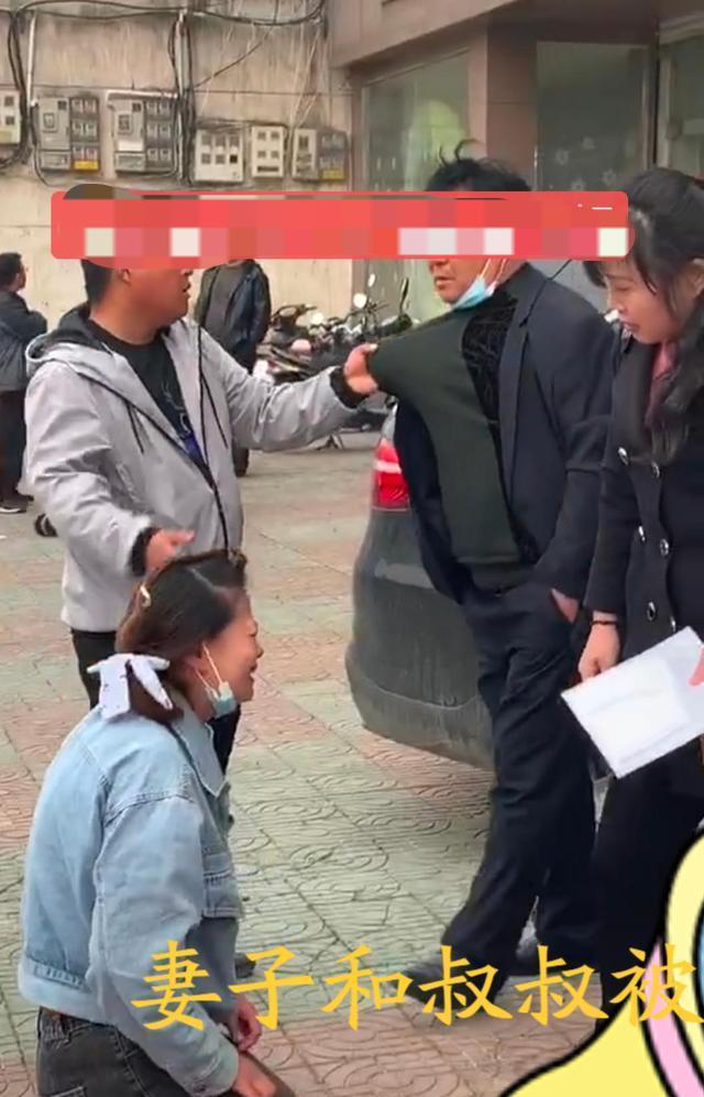 當天,男子帶著嬸嬸在賓館門口堵住了自己的叔叔和老婆,老婆跪在地上磕頭求放過。而男子也抓住叔叔,對著路人大聲嚷嚷:「 大家看看,這個男人是我叔叔,這個女人是我老婆,他們不要臉地搞在一起了。」