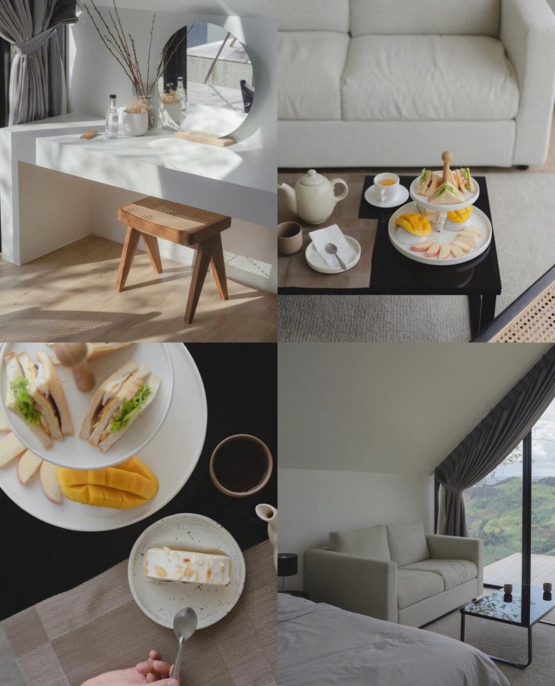 室內整體裝潢是白色系簡約風,搭配木質調家具,提升整間房間的質感,簡單又漂亮!當然最厲害的就是房外的露天陽台了,在環山簇擁下,客人可以在這裡享用浪漫晚餐和下午茶,甚至可以在這裡邊看山景邊烤肉呢~
