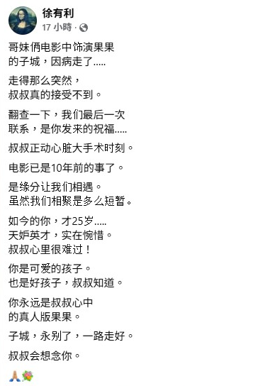 徐有利感慨萬千地寫道,電影拍攝已是10年前的往事,雖然相處時光短暫,但緣分讓彼此相識,「如今的你,才25歲……天妒英才,實在惋惜」。他哀傷悼念:「你是可愛的孩子,也是好孩子,叔叔知道。你永遠是叔叔心中的真人版果果。」字句間流露出深深的不捨之情。