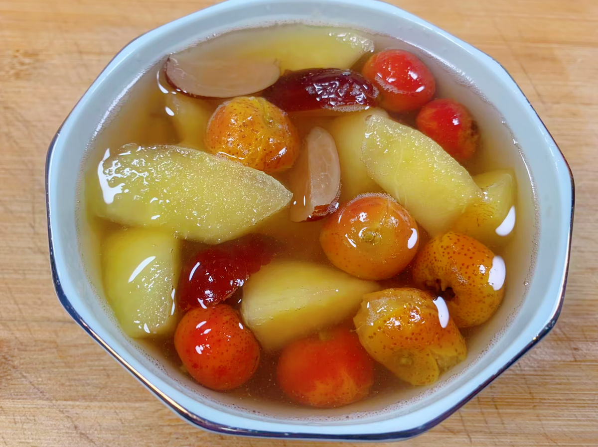 煮好的山楂蘋果紅棗汁盛入小碗內,趁熱喝,酸甜可口,連同煮熟的果子都吃掉,潤肺止咳還化痰,最主要的是增強腸胃蠕動,給腸胃「洗洗澡」,瞬間肚子舒服多了,隔三岔五煮一鍋,口不臭了,小肚子也小了。