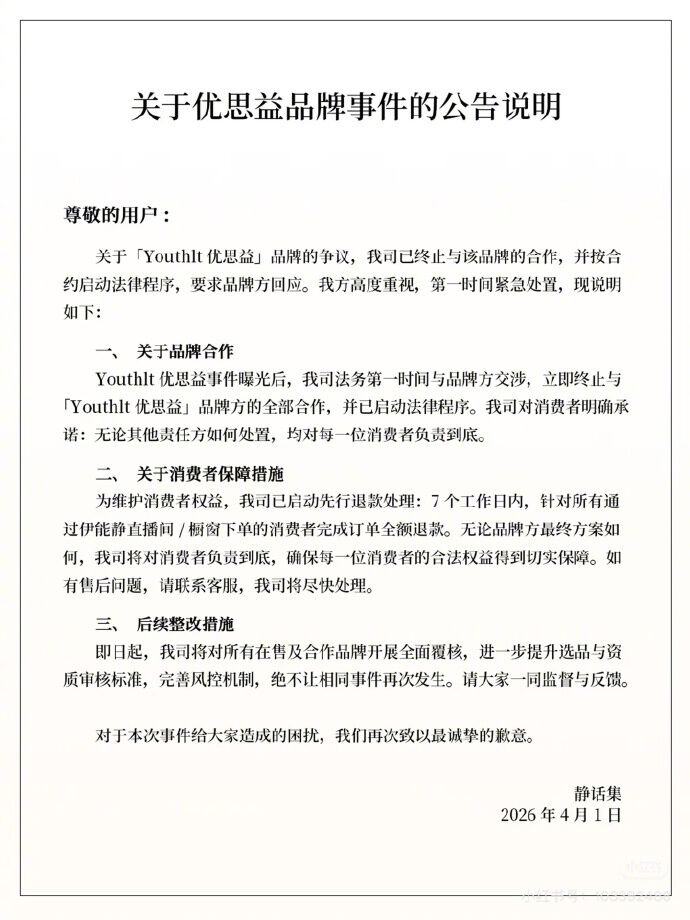 伊能靜所屬公司「靜恬集」緊急發出聲明,宣布全面停止與問題品牌的合作關係,同時啟動法律程序追究責任。聲明中承諾,將對所有消費者先行辦理退款,並表示往後會更加嚴格把關產品的篩選標準。這起爭議事件,再次凸顯中國市場「假洋品牌」亂象的嚴重性。