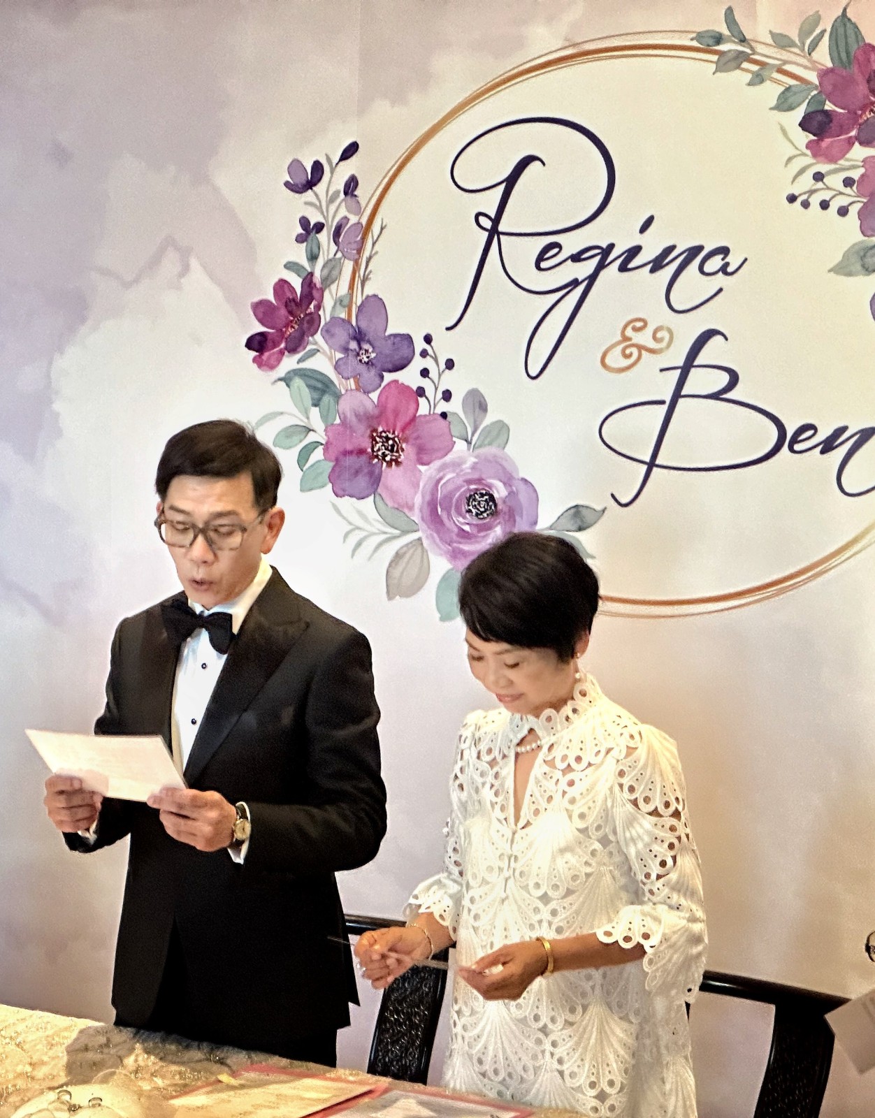 袁富華表示,儀式一切從簡,只有邀請雙方親友出席,在大家的見證下宣誓,還偷偷爆料自己平常背台詞駕輕就熟,但念誓詞給老婆聽時,卻相當緊張,講完一度眼眶泛淚「可以遇到珍惜彼此的另一半不容易,一起經歷及成長的過程,是我最享受和珍惜的,很感恩讓我找到了可以相守一生的她。」