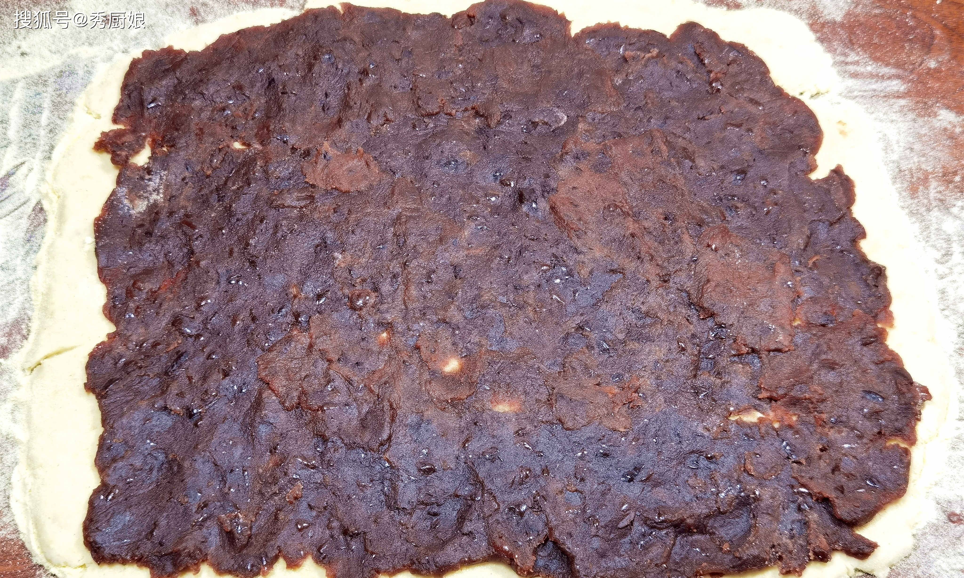 3.製作:將醒發好的糯米麵糰擀成3毫米厚的麵餅。在擀好的麵餅上均勻塗抹一層紅棗泥, 從麵餅的一頭開始,將其捲起成長條狀。 將卷好的麵條切成小段,每段長度適中。