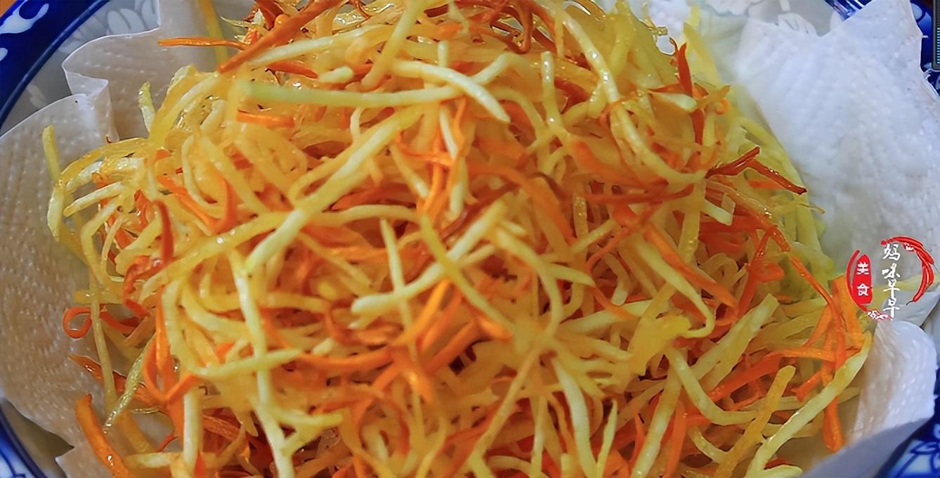 4,鍋裡多倒一些油,油溫8成熱時,放入馬鈴薯絲和地瓜絲大火炸制,差不多炸6分鐘左右,把水分炸干就可以了,炸好後控油撈出,放入鋪有油紙的盆子裡。