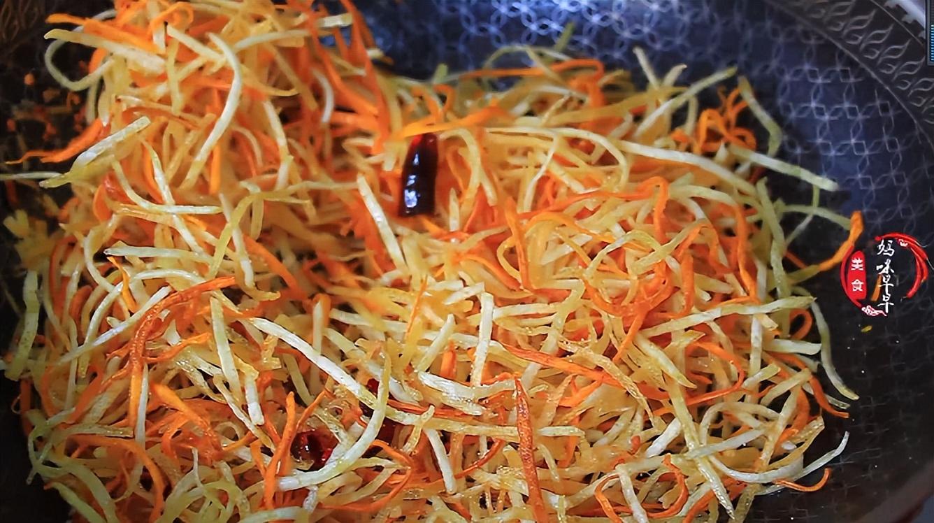 5,鍋裡的油倒出來,可以留著炒菜用,然後放入幾個干辣椒煸炒出香味,接著把火關掉,倒入炸好的馬鈴薯絲和地瓜絲,用筷子翻拌均勻。然後加入適量的食鹽,一點兒胡椒粉,繼續翻拌均勻。