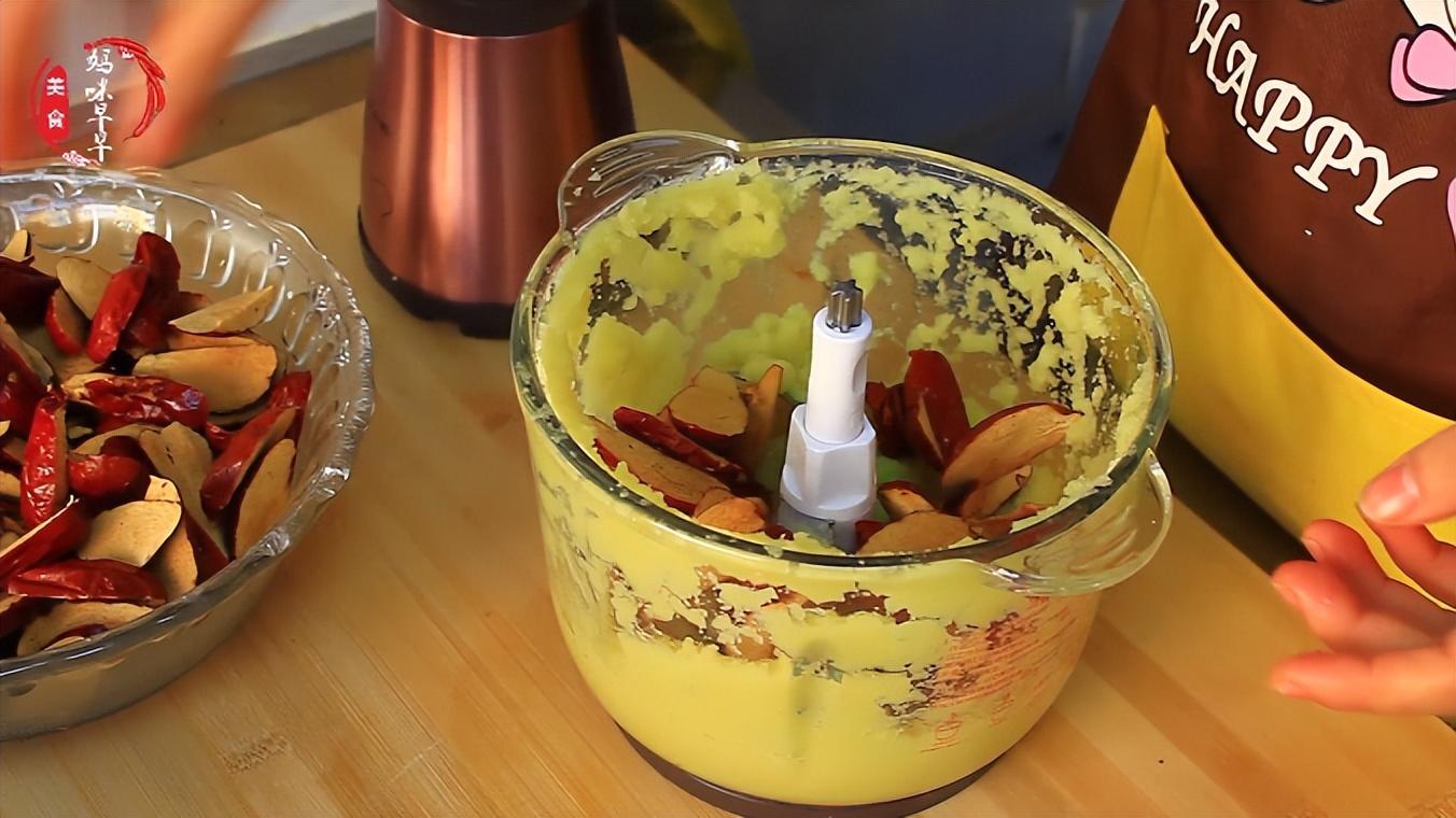 2、500克紅棗用溫水浸泡30分鐘,然後去掉棗核,將紅棗切碎,放入料理機打成棗泥,打好之後和生薑混合在一起,叫拌均勻備用。