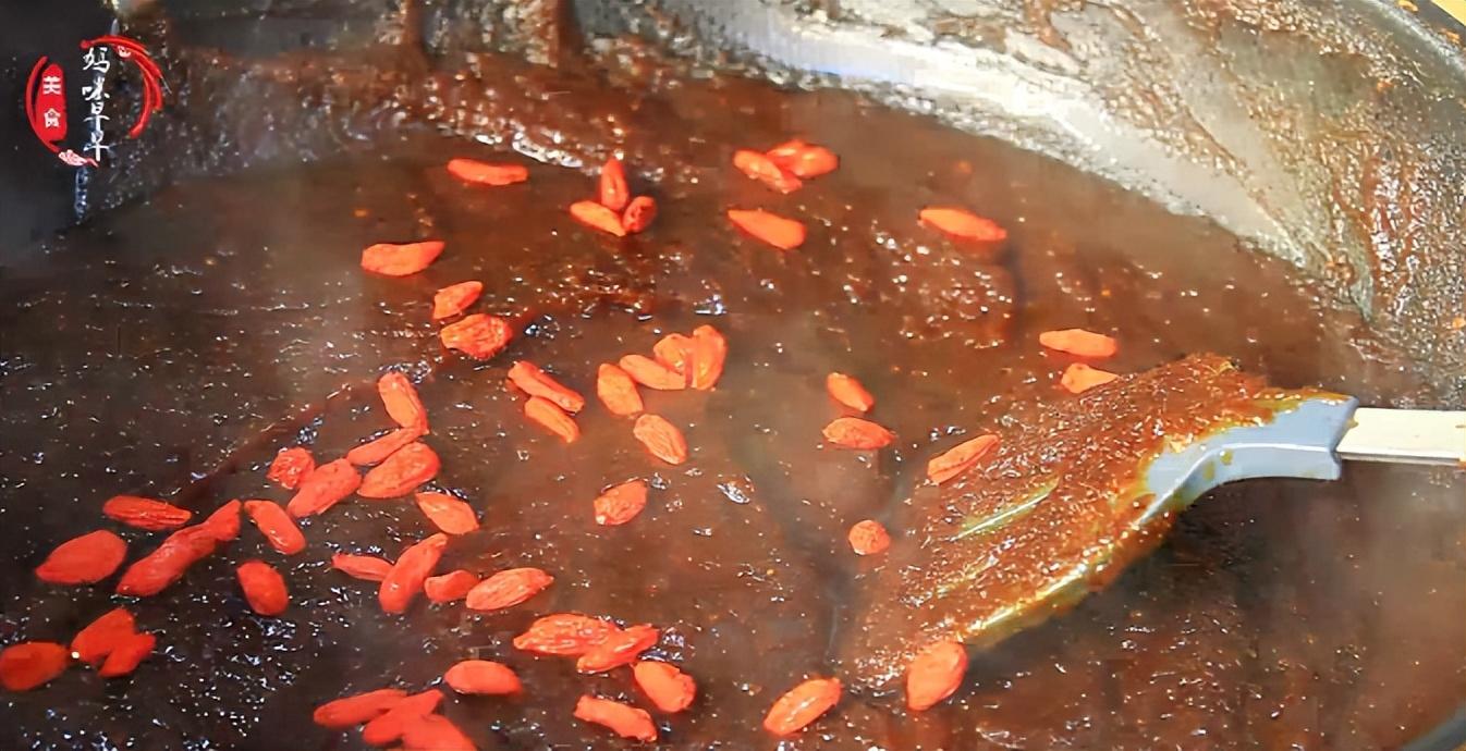5、一直炒到姜棗的顏色變深,然後加入桂圓和枸杞翻拌均勻,這個時候翻拌時已經很有難度了,比較黏,而且阻力大,用鏟子鏟一些姜棗泥,如果不能掉下來,說明已經好了,關火盛出。