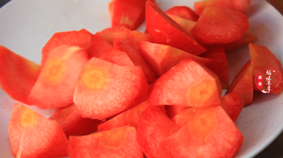 1、胡蘿蔔洗凈去掉兩頭,然後颳去外皮,胡蘿蔔營養豐富,每100克只有40大卡的熱量,含有豐富的維生素A,能保護眼睛,尤其是孩子要多吃,切塊後裝盤備用。
