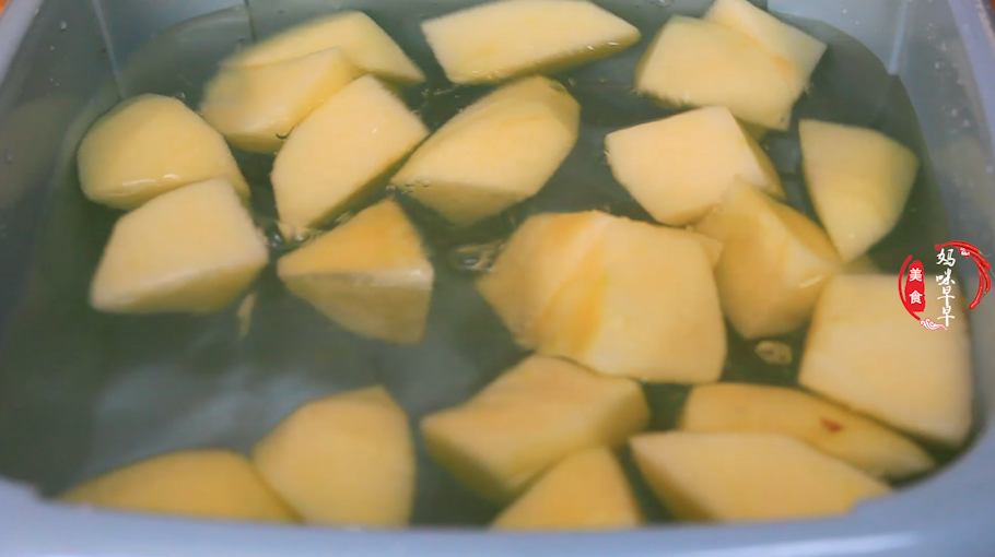 2、蘋果去皮後切成小塊,蘋果每100克含有52大卡的熱量,含有多種維生素和微量元素,對身體好處多多,切好放入清水防止氧化。