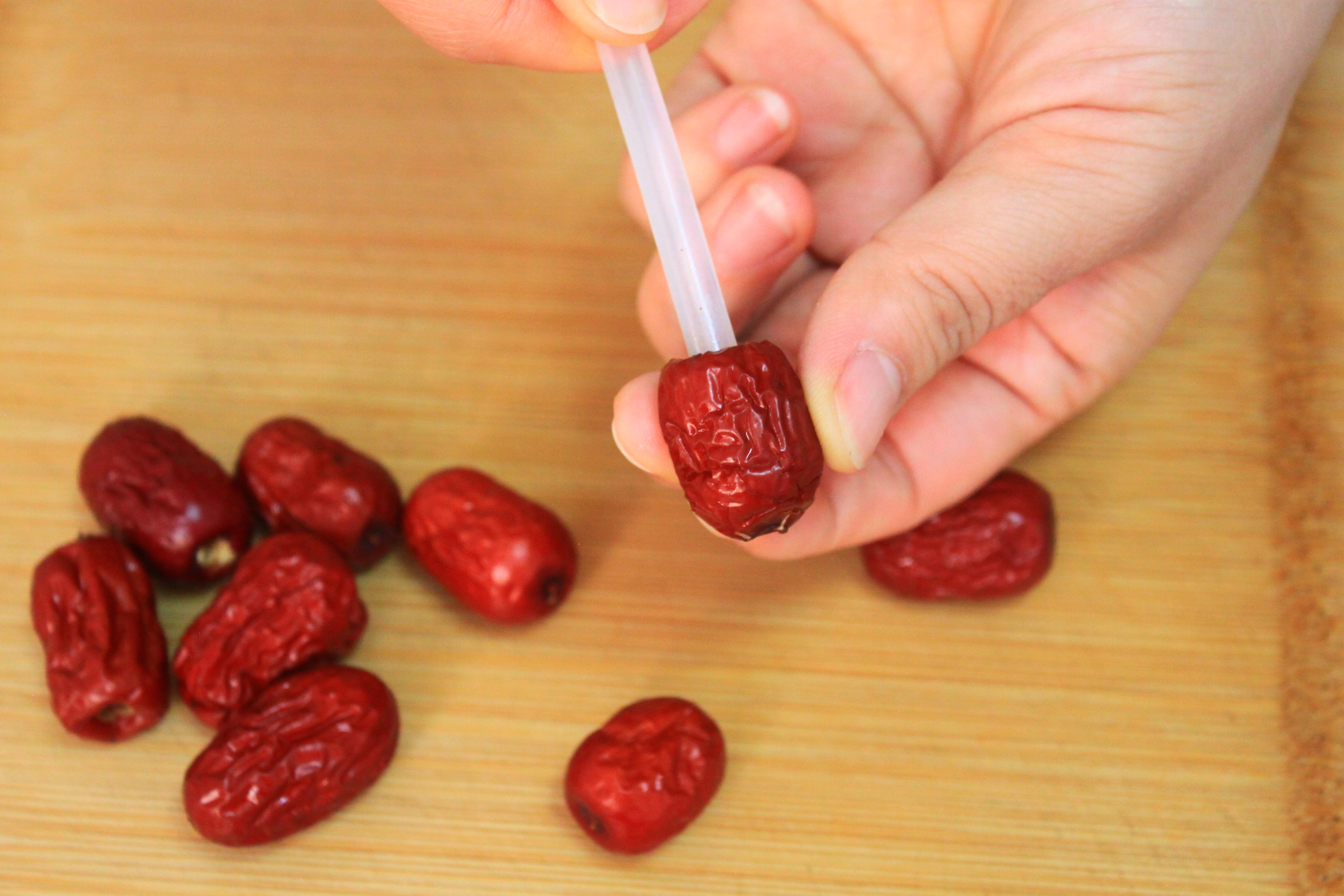3、大紅棗清洗乾淨後去掉棗核,找一個硬一點的吸管,這樣去棗核特別的方便。一小塊生薑切成細絲備用。