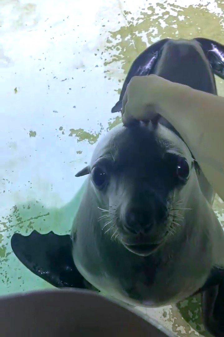 只見影片中一隻海獅正睜著水汪汪的大眼睛看向鏡頭,這時飼育員就伸出手、看似要摸牠的頭又像是要幫牠抓抓癢,而海獅雖然可能不知道飼育員在幹嘛,但也相當乖順地看著對方...