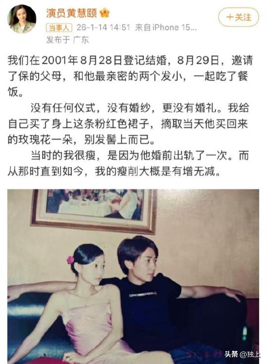 黃慧頤在社群平台詳細還原當年經過,她說大約在2000年時,保劍鋒因為婚前劈腿被抓包後認錯,還特地飛到廣州某間餐廳下跪求婚,承諾要帶她去上海一起生活。兩人接著在2001年8月28日正式登記,隔天只簡單邀請男方父母和兩位好友吃頓飯,完全沒有任何婚禮儀式。