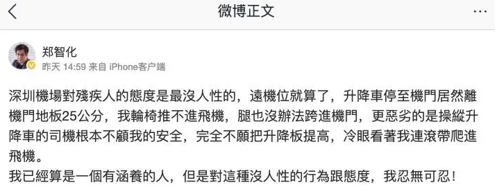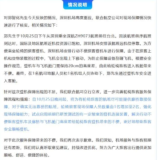 事件引發廣大關注後,深圳機場迅速做出回應,除了解釋20公分高度差是基於安全考量的標準規範外,也承諾會加強相關服務。鄭智化隔日再度發文,語氣轉為平和,直指問題出在升降車司機的個人行為,而非整個機場的制度。他不忘為深圳這座城市說好話,希望機場服務能夠提升到與城市品質相符的水準。