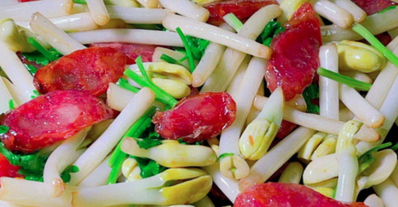 說起花生芽,我第一次吃是在一位做醫生的家裡,當時看到這個菜特別陌生,我問他這是什麼菜,他說這是花生芽,每周吃2-3次,對心臟非常有益!後來我查閱了一些資料,發現花生芽中含有一種特殊物質「白藜蘆醇」,白藜蘆醇具有「護心臟、降血脂、延緩衰老、清血管、預防心血管疾病等功效」,而且據研究,花生芽含有的白藜蘆醇比花生都要高几倍,所以一年四季,無論花生芽多貴,我都會買一些給家人吃。而今天老胡分享的花生芽的吃法,是我和家人最喜歡吃的一種做法,它就是「花生芽炒甜腸」,甜腸的鮮香味和花生芽的香甜味結合在一起,使這道菜好吃又好看。接下來我就把這道「花生芽炒甜腸」的具體做法分享給大家。
