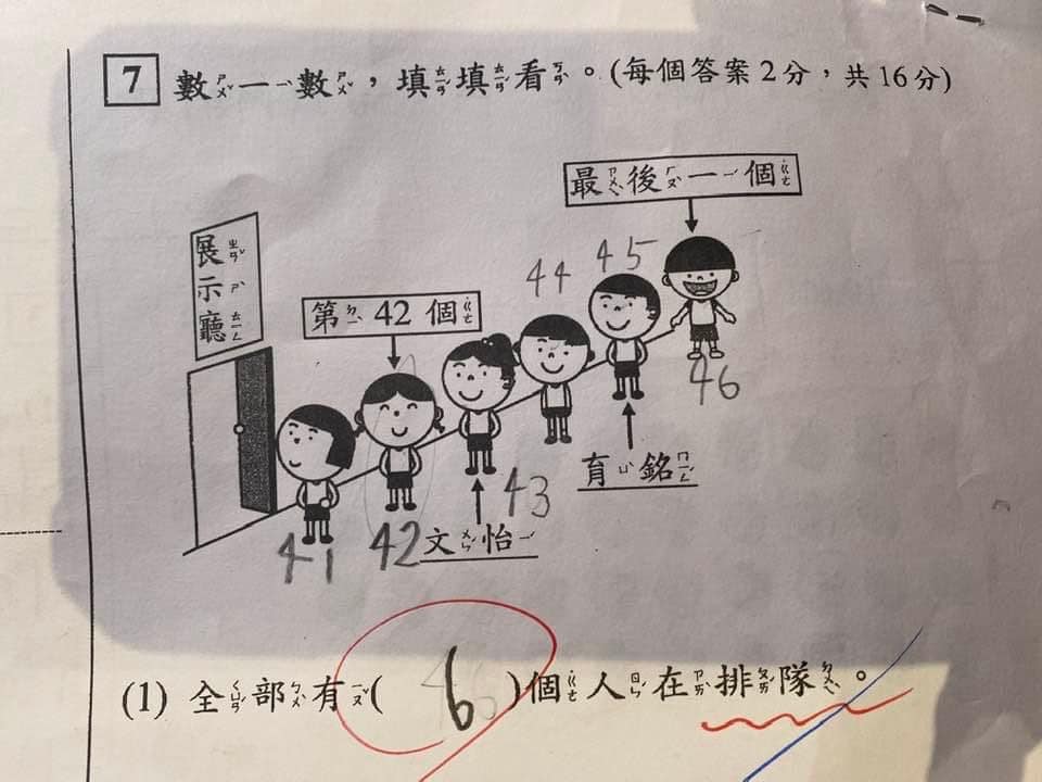 台北市聯醫忠孝院區醫師「陳昶宇」在臉書上表示,朋友的女兒目前就讀國小一年級,照理來說她的作業、考試,對大人來說應該是輕鬆的,不過在他看來卻有大大的爭議!只見考卷上畫著幾個人在展示廳外準備進場,而題目的重點是要問有多少人在排隊,雖然依照圖片來看是6個人在排隊,但由於第2個人的位置上特別標註了「第42個」,讓朋友的女兒最後寫下全部有46個人在排隊的答案,沒想到仔細思考後的答案還是錯了,正確答案為6個人在排隊。