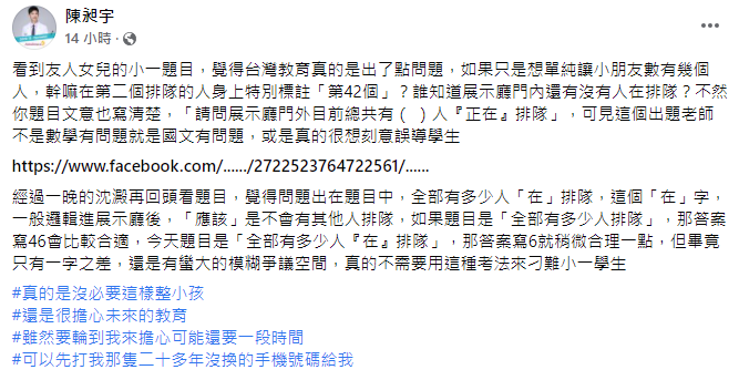 陳昶宇在貼文中表示:「如果只是想單純讓小朋友數有幾個人,幹嘛在第二個排隊的人身上特別標註『第42個』?誰知道展示廳門內還有沒有人在排隊?」生氣的說道,出題老師不是數學有問題就是國文有問題,或是真的很刻意想要誤導學生。不過相隔一晚之後,陳昶宇表示自己沉澱後再次看過題目,覺得如果題目是「全部有多少人排隊」,答案或是46比較合適,但今天題目是「全部有多少人『在』排隊」,答案確實是6比較合理,不過最後他也無奈認為這就是一字之差而已,不需要如此刁難小一的孩子。