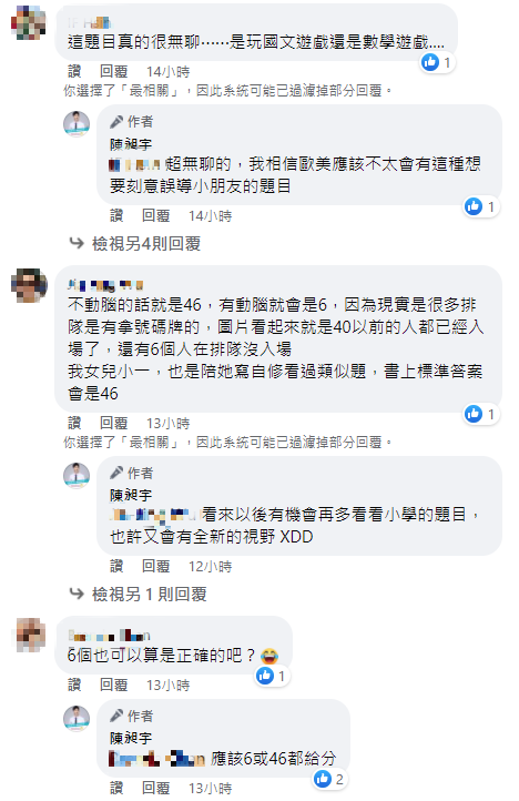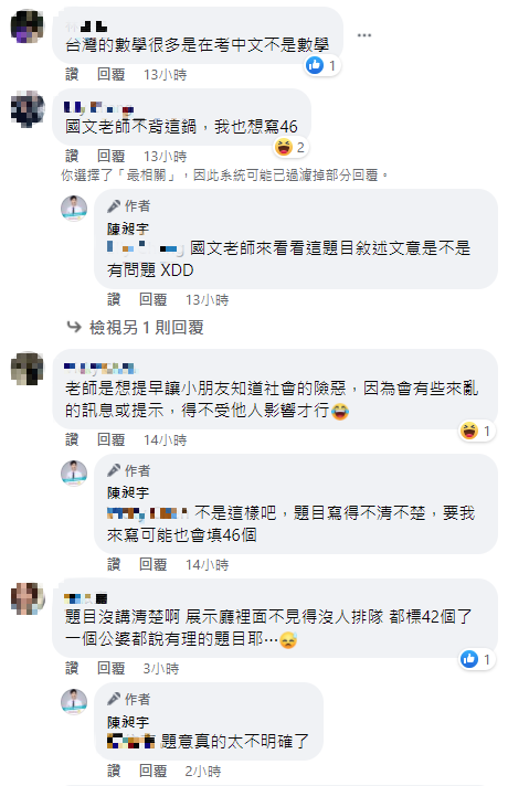 貼文曝光後,網友們也紛紛留言回應,「這題目真的很無聊⋯⋯是玩國文遊戲還是數學遊戲」、「國文老師不背這鍋,我也想寫46」、「這題目爭議性不小啊」、「108課綱重視閱讀,但是我覺得矯枉過正,很多題目都有陷阱」,就連藝人侯昌明也在個人臉書發表意見:「這樣的考法能幫助孩子的數字和邏輯的進步嗎?亦或者,會不會降低孩子的學習興趣呢?...何謂教育?讓孩子學習思考邏輯和解決問題的能力才是培養競爭力不是嗎?」陳昶宇也強調就算要訓練閱讀能力,文意也該寫清楚,不該是設下許多陷阱考倒學生。
