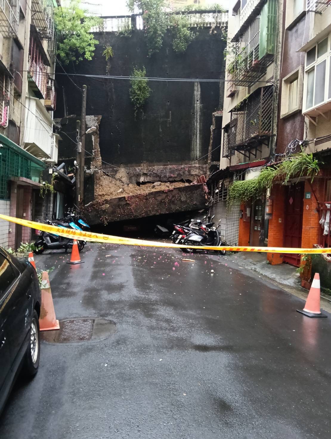 25日清晨6時50分左右,擋土牆終究不敵土石重壓而崩塌。下方一棟5層樓公寓外牆遭到撞擊,結構嚴重受損,現場還有兩輛機車遭到波及。所幸前晚即時疏散,事件未造成死傷。
