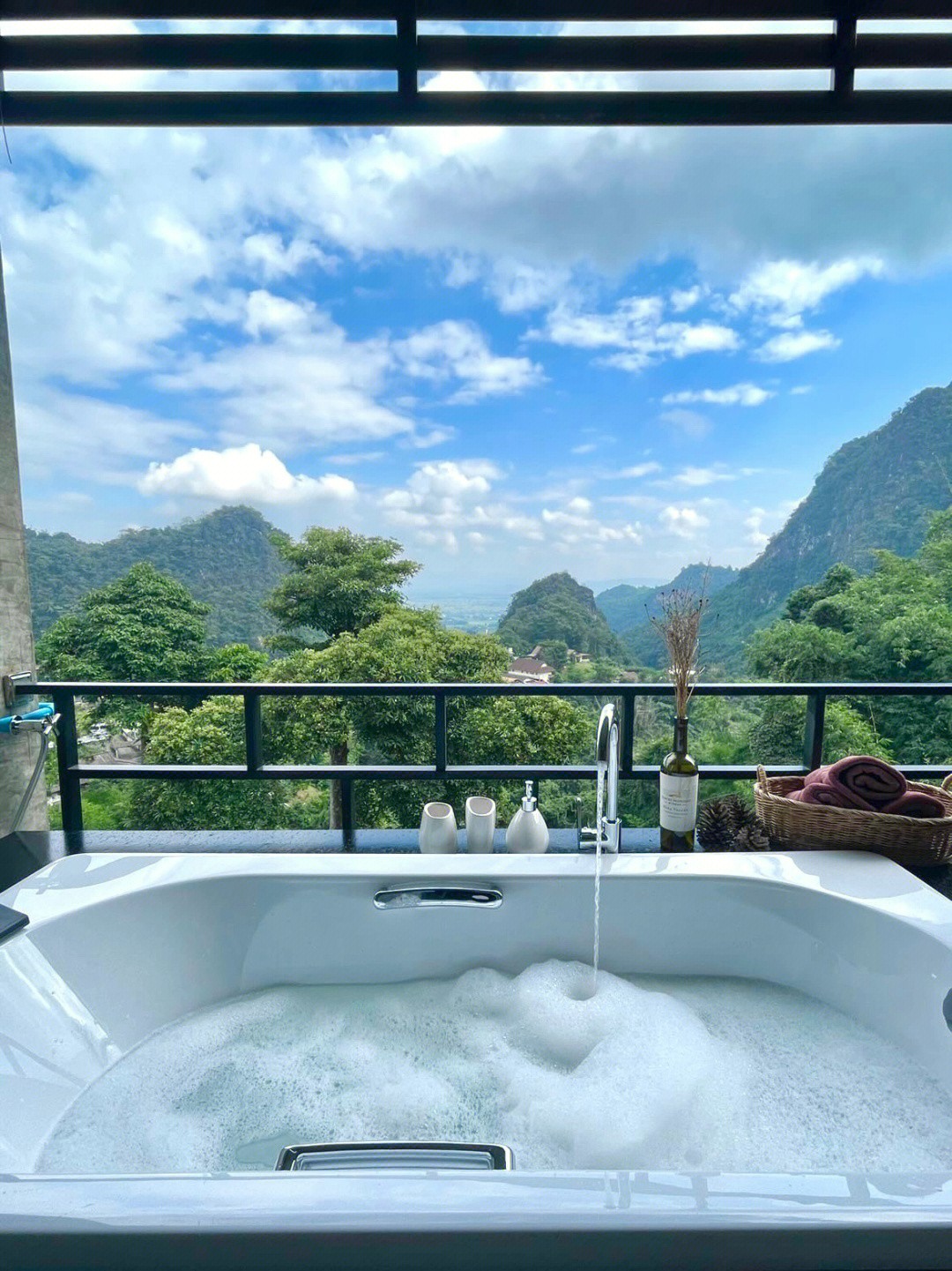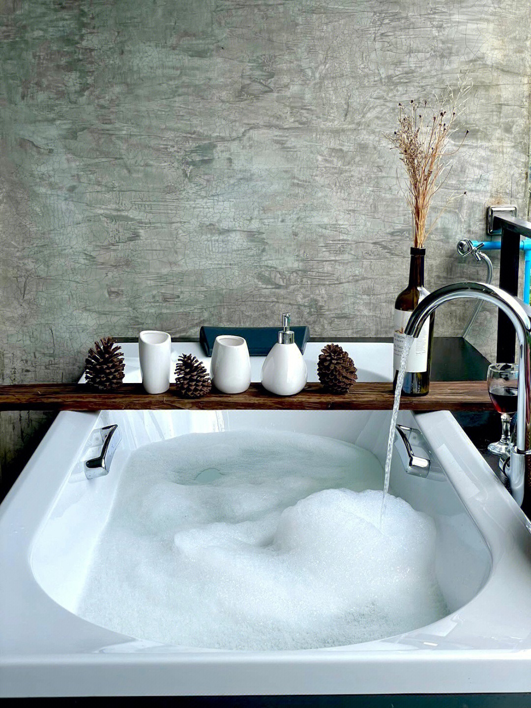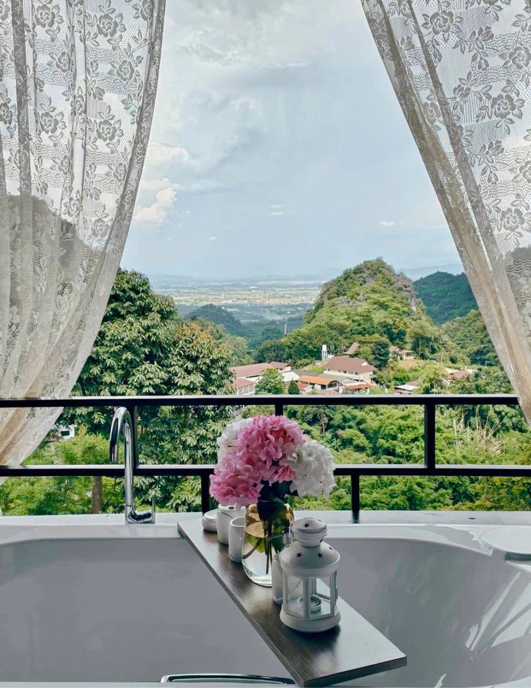 另外最厲害的就是這個擺在陽台的露天浴缸了!坐在裡面泡澡順便俯瞰山巒美景,尤其是夕陽時分,落日就在你的身側,浪漫至極啊~~