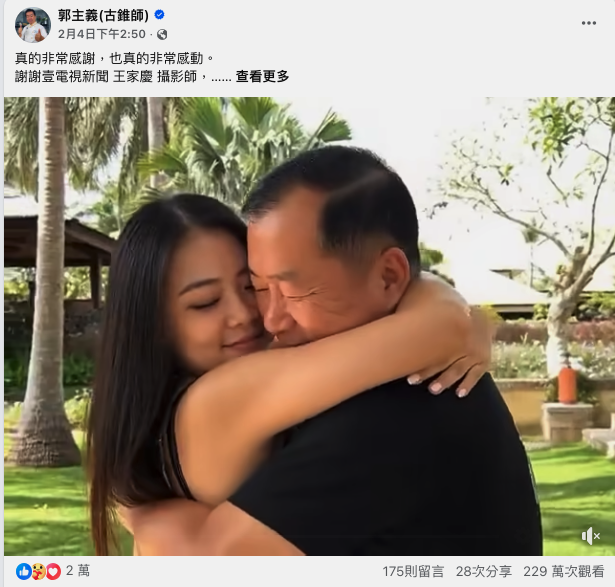他在社群平台上坦言,當畫面浮現眼前那刻,心臟像是被重重撞擊,淚水立刻在眼眶打轉,差點當場失控痛哭。郭主義對攝影師的用心深表感激,並對天上的女兒深情呼喚:「不曉得寶貝在另一個世界是否安好?爸爸會在這兒用心過活、認真烹飪、時刻思念著妳。」