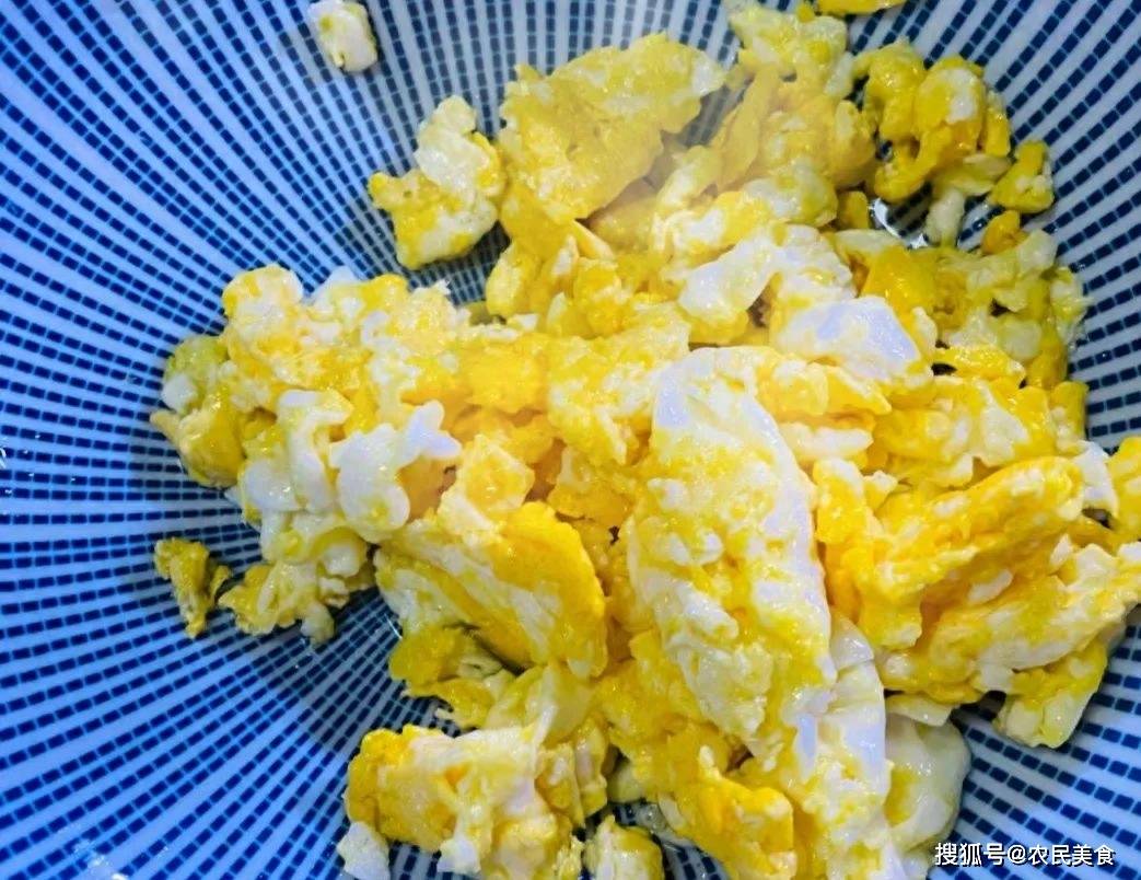第二步,雞蛋打入碗中攪拌均勻,熱油翻炒雞蛋至金黃色,炒得稍微碎一點,盛出備用。