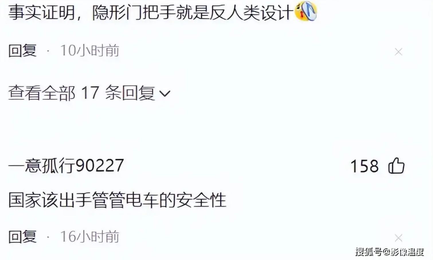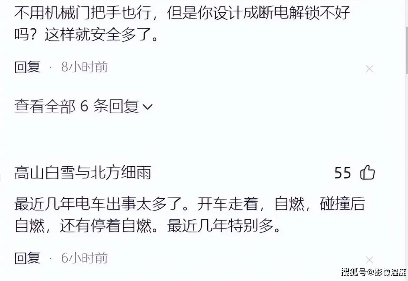 此事引發了網友的熱議,畢竟新能源汽車是未來趨勢,我們無法抵擋,但是,新能源汽車也需要具備機械素質,不能完全靠智慧和電路操控。如果發生碰撞等突發狀況,智能化失靈、電路故障,本來可以物理原理打開車門,非要用時髦的智能化方式開門,一旦發生火災,就出現了電路故障、門打不開的狀況。