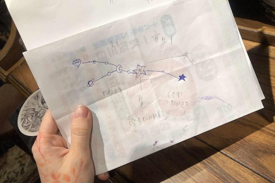 老公想了想便提出把兩人的星座連在一起、背景再加上老婆生日花的想法,然後還拿了日曆紙把自己的構想畫成簡陋的草圖!只見原PO簡單的畫出星座的線條,不會畫的部分就用文字輔助,看起來十分陽春,網友也坦承:「畫畫很爛,是想為難誰…」實在想像不出來這個圖案刺到身上是什麼樣子啊~XD