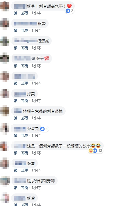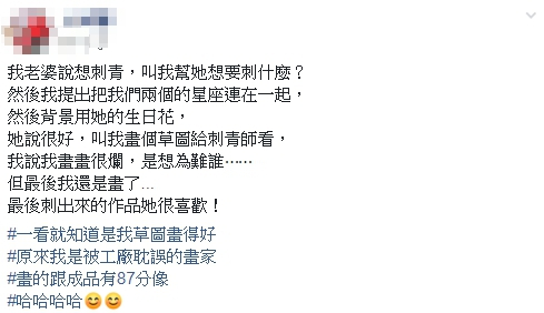 刺完後老婆開心的表示非常喜歡,老公驕傲地在文末標記「#一看就知道是我草圖畫得好,#原來我是被工廠耽誤的畫家,#畫的跟成品有87分像」網友也都大感驚豔,紛紛留言:「這刺青師簡直神了」、「這是刺青師拯救了一段婚姻的故事」、「刺青師傅太強大了,把你的圖美化到不可思議」、「是豬隊友還要帶你爬分的概念😂」、「化腐朽為神奇」