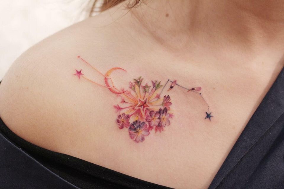 不過老婆還是堅持拿著老公畫的草圖給刺青師看,沒想到刺青師思考了一下後就這樣「化腐朽為神奇」,把草圖上的線條轉變成色彩繽紛又精緻的美麗刺青!只見刺青師把兩個星座分別用橘紅和深藍表示,漸層的月亮則是刺青師突發奇想的結果,此外中央立體的星星和周圍放射狀的紫紅色「紅櫻花草」也融合的十分協調,是一個色彩夢幻又含有特別意義的漂亮刺青!