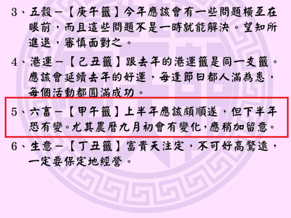 根據《ETtoday新聞雲》報導,雲林北港朝天宮在今年大年初四(2025年2月1日)抽出年度公籤,其中六畜部分抽中甲午籤「趙子龍重圍救阿斗」。籤詩預示上半年大致順遂,但下半年恐有變化,特別強調農曆九月初需要特別留意。