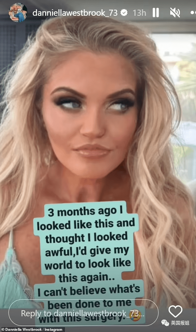 後來,丹妮拉接受了採訪,她表示手術失敗,她被毀容了。她在帖子中寫到:「三個月前我長成這樣,雖然這樣子不完美,但我願意回到這時候的長相。我無法相信他們在整容手術中對我的臉做了什麼!」