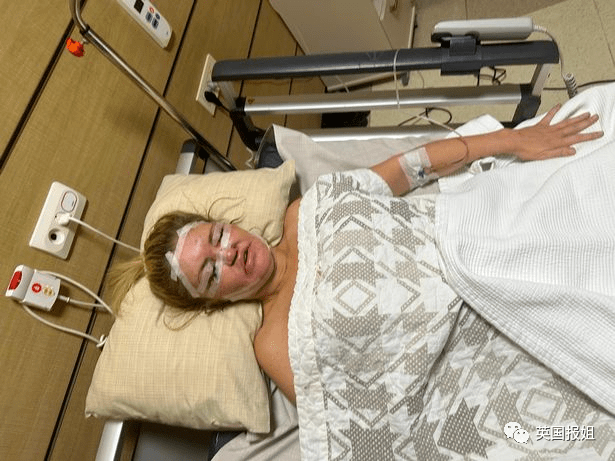 手術後的照片顯示,丹妮拉躺在病床上,全臉腫脹,臉周纏繃帶帶,左臂內側打著點滴。