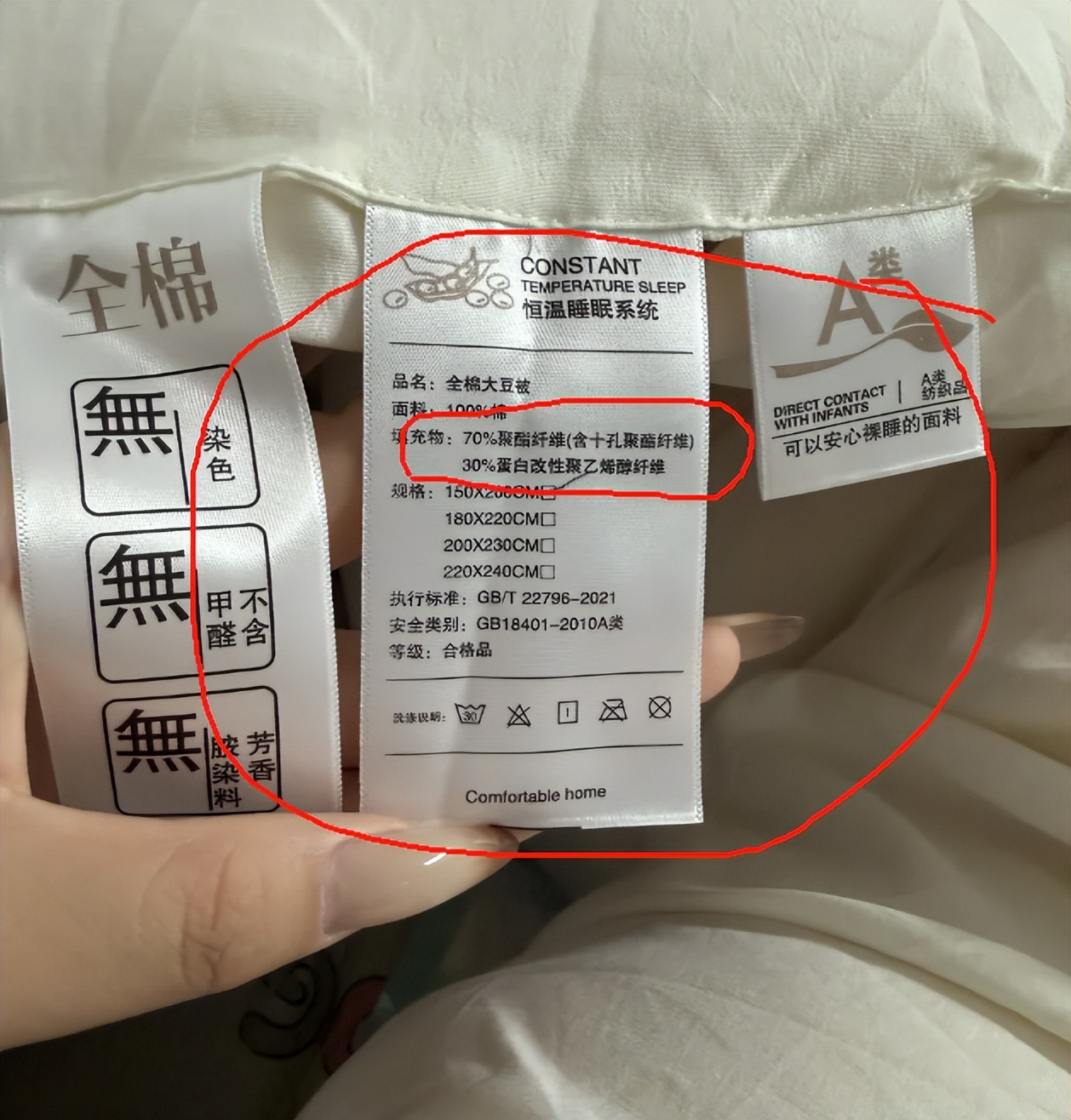 那如果你家中的大豆被,聚酯纖維佔比比較高的話,那就不太建議各位選擇了,純純是蓋「塑膠袋」。