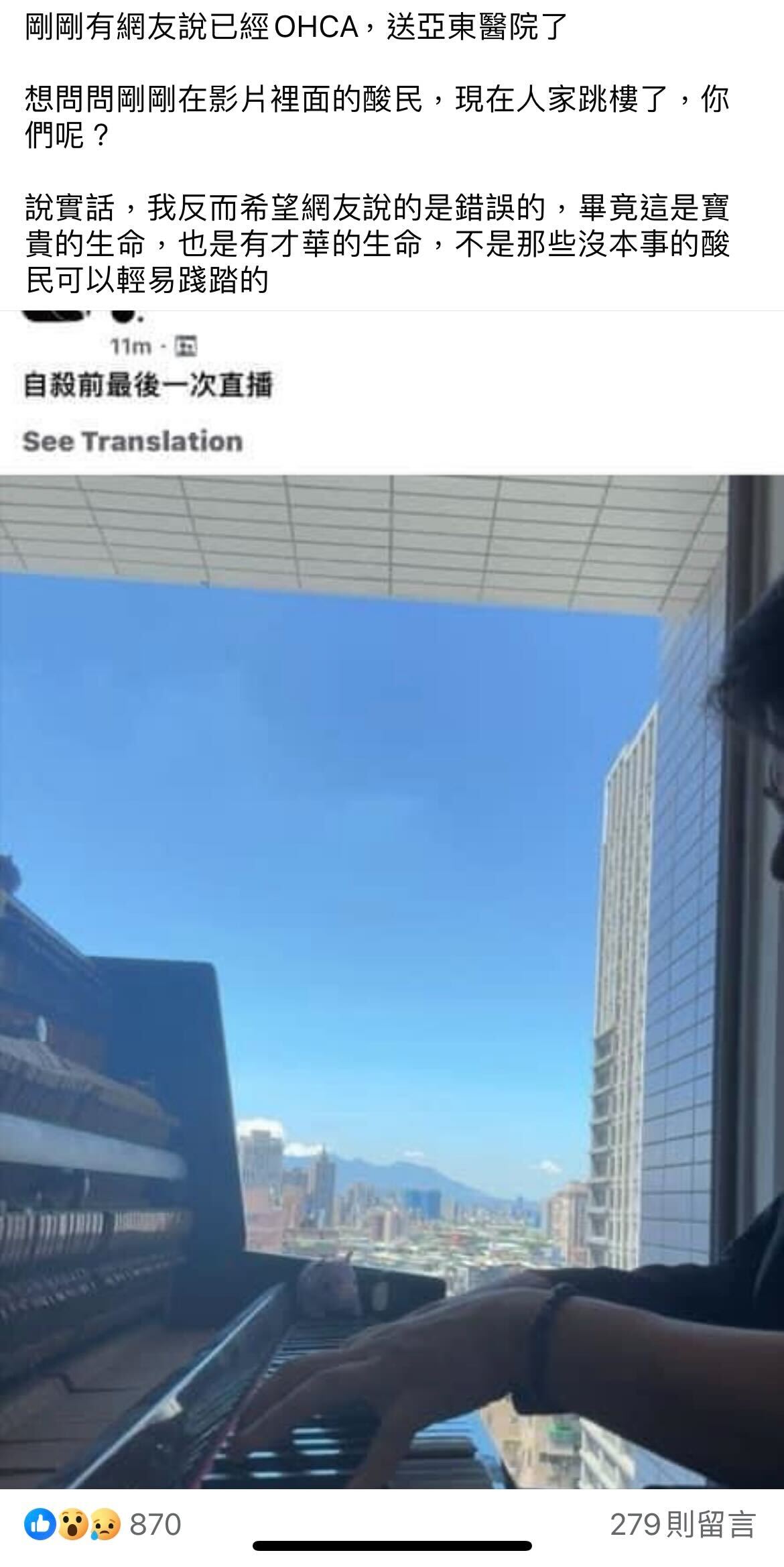 快訊/臉書揚言輕生!台灣大咖直播後「從高樓跳下」當場失去心跳 網友嚇傻 :「報警了仍來不及」