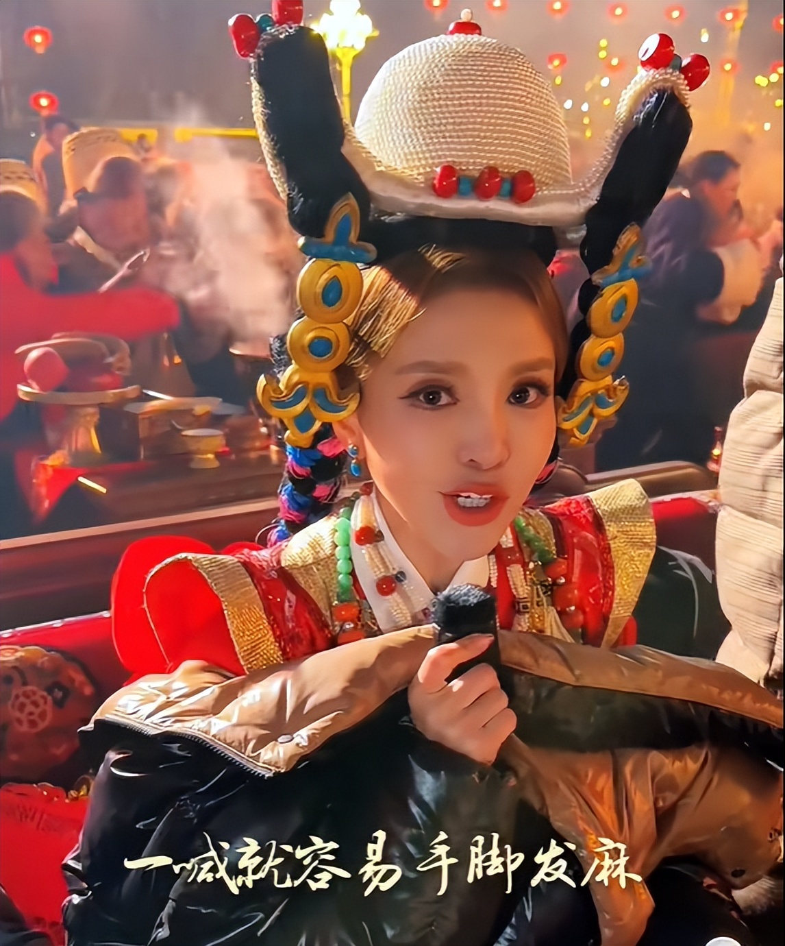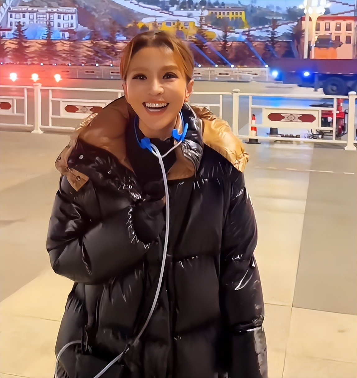 她全程手插兜,看來是真的冷了,而且臉都被凍得青紫了。