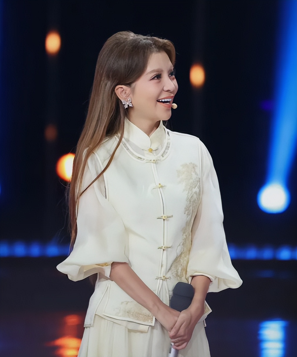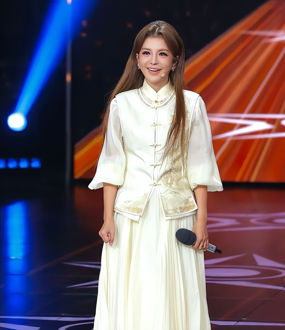 這次她罕見地沒有裝嫩,妝容清淡,頭髮就是簡單的披肩髮,配上白色大衣,氣質優雅,就像出自書香門第的大小姐。