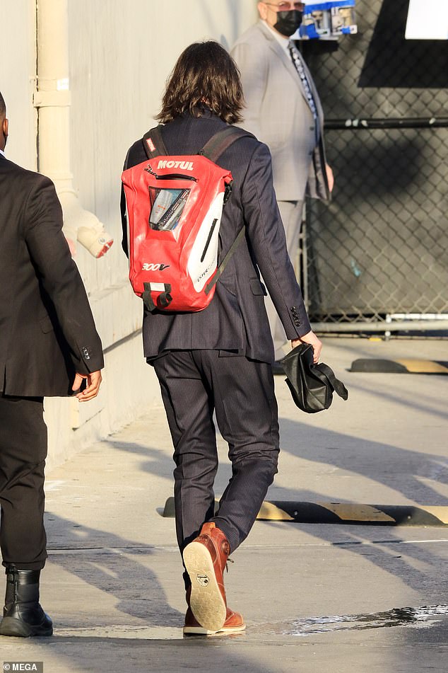 十分做自己的基努李維也添加了不少混搭元素,例如腳上的皮鞋被他換成棕色靴子,背上還背了法國Motul的紅白雙肩後背包,雖然看起來有點混亂,不過帥氣的基哥真的什麼造型都能駕馭呢XD