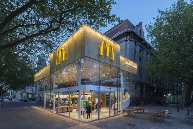 荷蘭這間位在鹿特丹的麥當勞,請了建築設計團隊來幫店面做改造,而一開始看到的那生硬黃紅配色加上黑白梁柱,重新設計後則轉換成透明的玻璃屋風格,特點除了以大片的落地玻璃下去打造,從外清楚看進去更可以直接欣賞到裡頭的風采。
