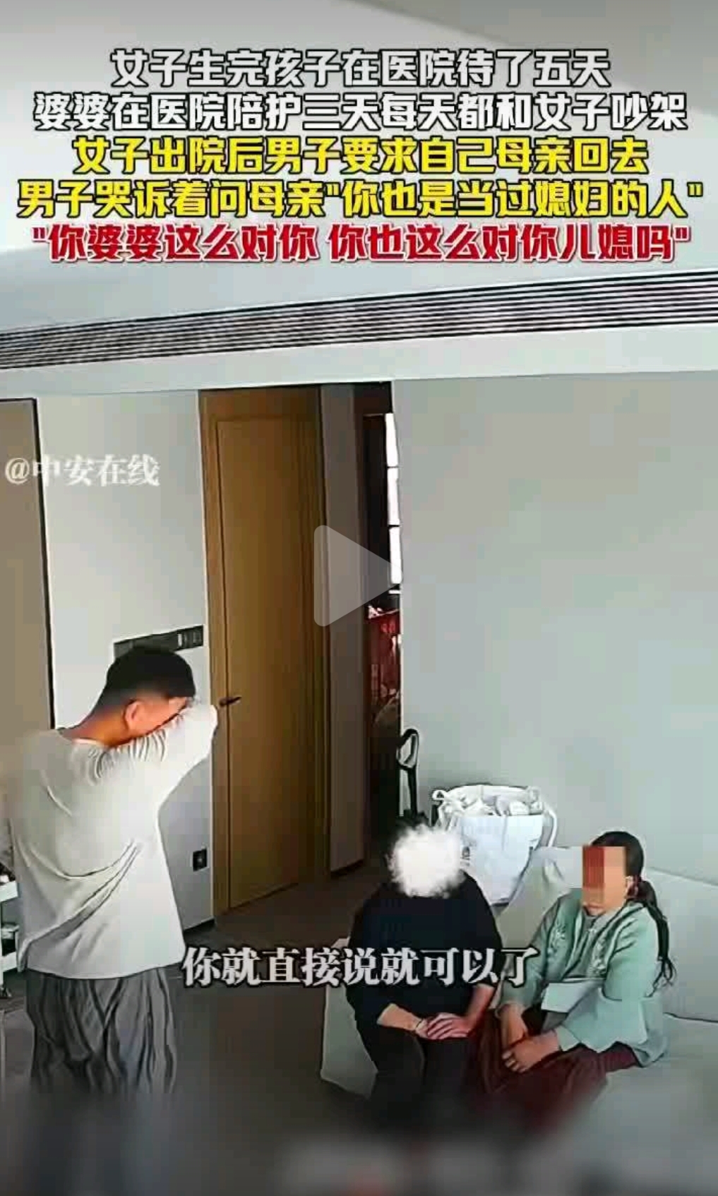 3月2日,發生在四川一家庭,男子在家庭監控下哭訴,妻子在醫院產子,總共在醫院就待了五天,結果自己母親去了三天,卻連續三天都在和妻子吵架。