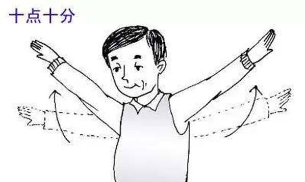 手指要綳起來,把兩隻手舉到鐘錶上十點十分的位置,用這個動作走路,每天堅持走兩百步。