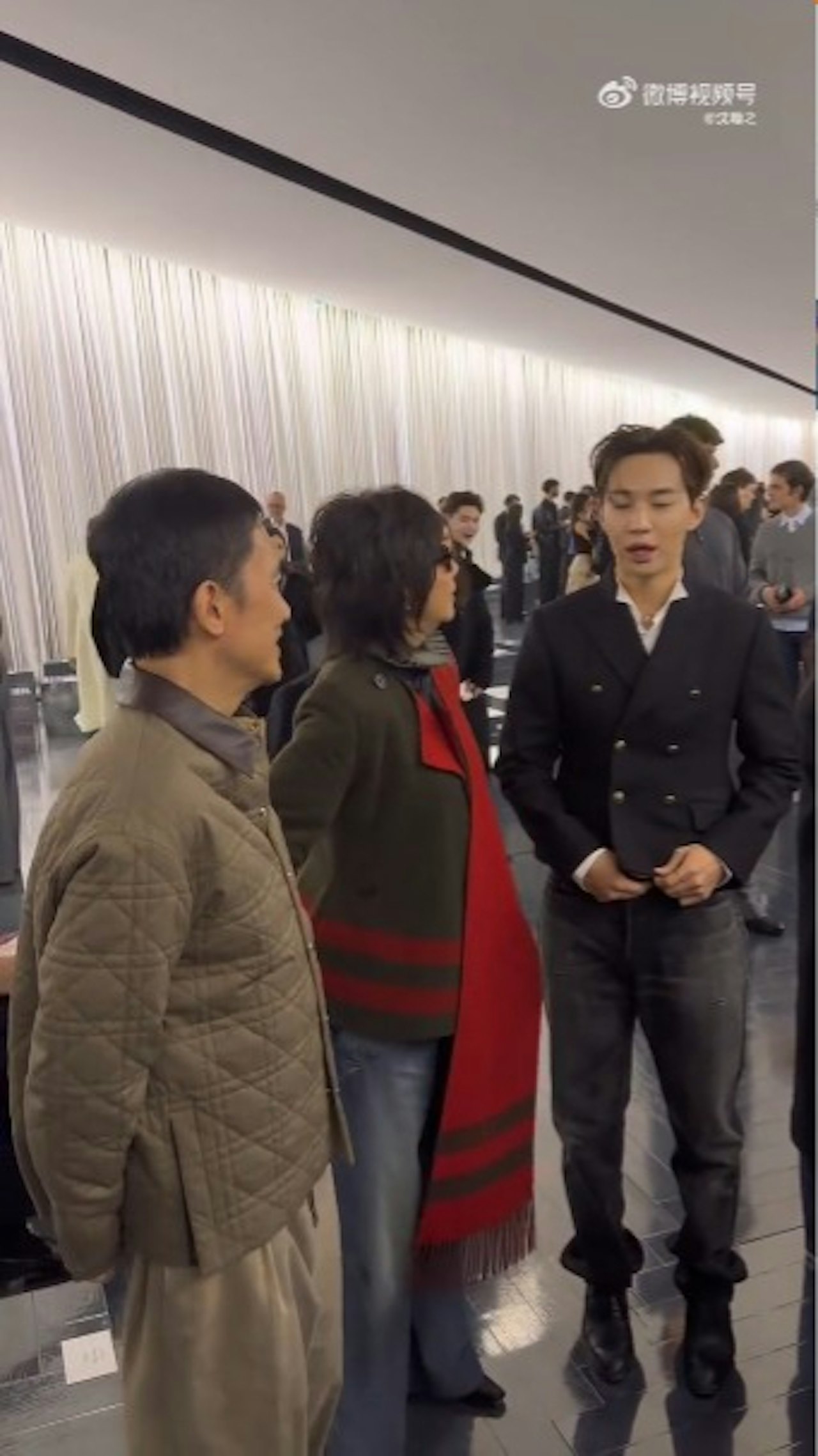而梁朝偉則隨侍在側,一下雙手插口袋、一下放在身後稍息,可見他非常拘謹、不自在。但神奇的是,他的視線一直對著2人,並時刻保持微笑,形成「1靜2動」的奇妙畫面,被網友戲稱是「社恐式陪伴」。