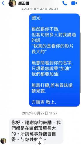方順吉在得知顏正國離世後發表感性文章,道出兩人相似的心路歷程「我們都是從小在這個環境長大的,也都是小時候就聲名大噪過。只有我們這些有過相同經歷的人,才明白下半輩子要承受那句『小時了了,大未必佳』的折磨」。他表示,看到顏正國藉由《角頭》電影重返演藝圈時,內心感到無比欣慰與激動。