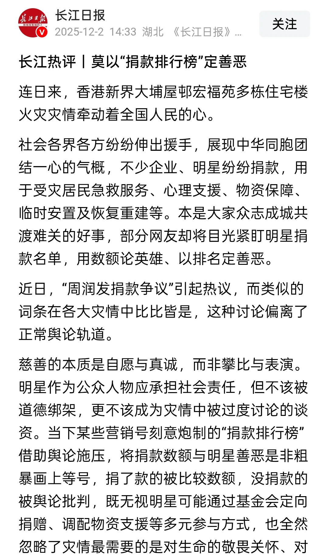 12月2日,長江日報針對此事做出了回應,標題只有十個字,即:莫以捐款排行榜定善惡!