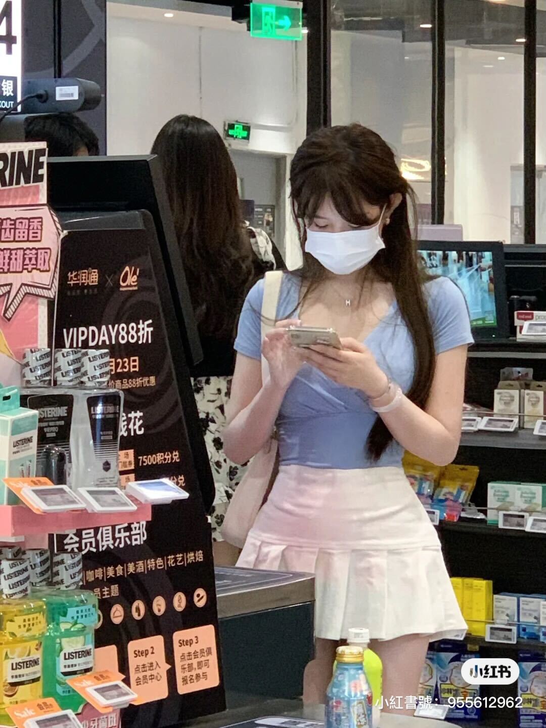 畫面中這位口罩美女身穿淺藍短袖上衣,下面配白色可愛裙子和高跟鞋,搭上自己原本就有的超好比例長腿,整個人看起就是格外顯眼,尤其口罩正妹的手腳也特別纖細,所以相對於其他客人,視覺看過去就是會一秒被她吸引住。