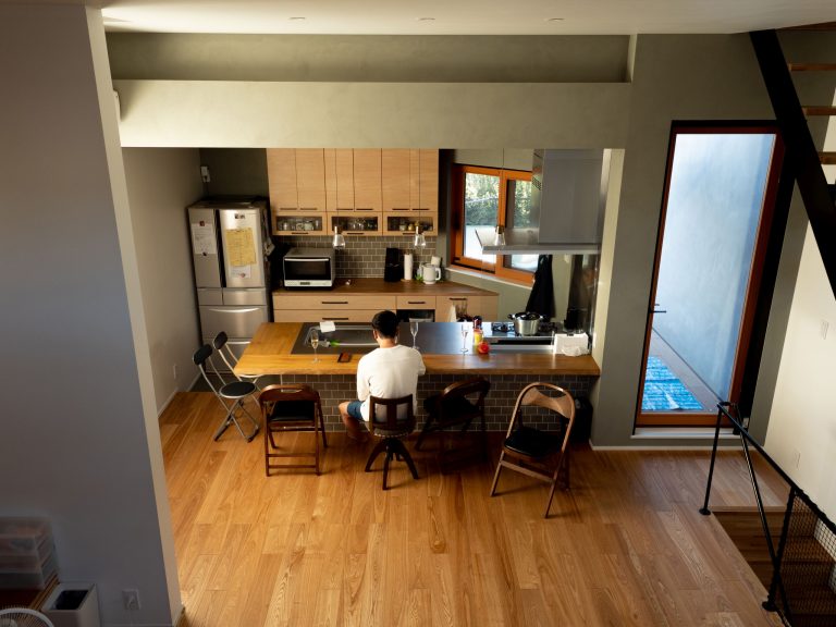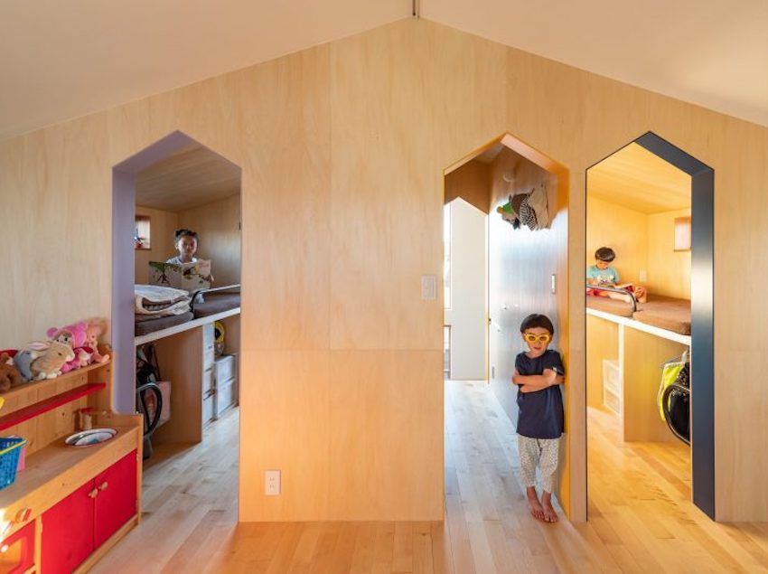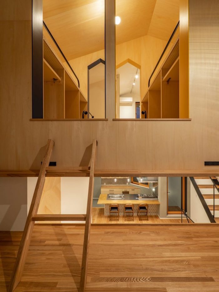 整個室內空間因為少了許多密實的厚牆,使得不同的空間都能看到各層樓的視野,而連接二樓到三樓的黑色爬竿提供小孩移動同時滿足樂趣。
