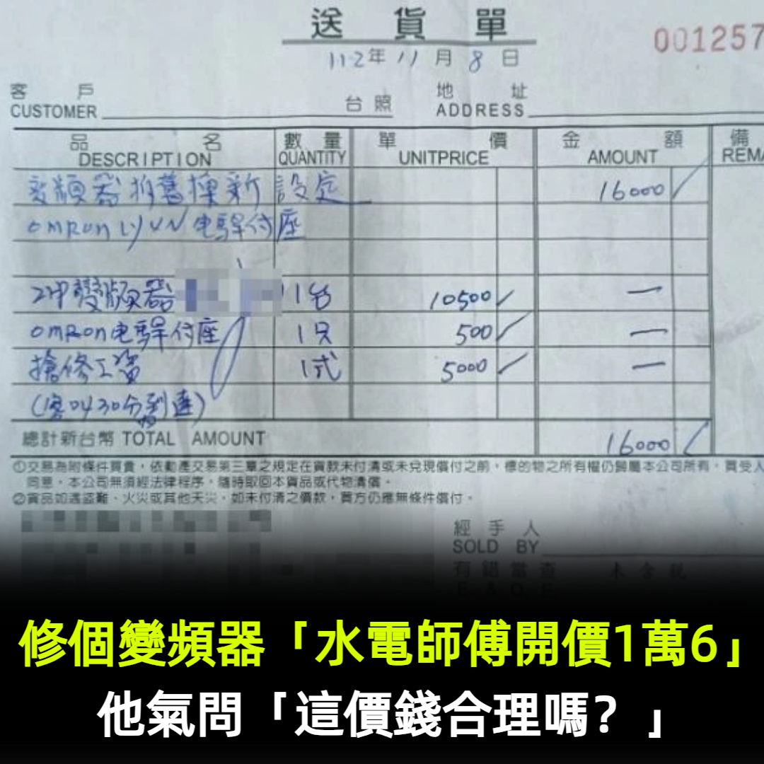 修個變頻器「水電師傅開價1萬6」他氣喊坑人錢!內行揪1細項「必須提前告知」
