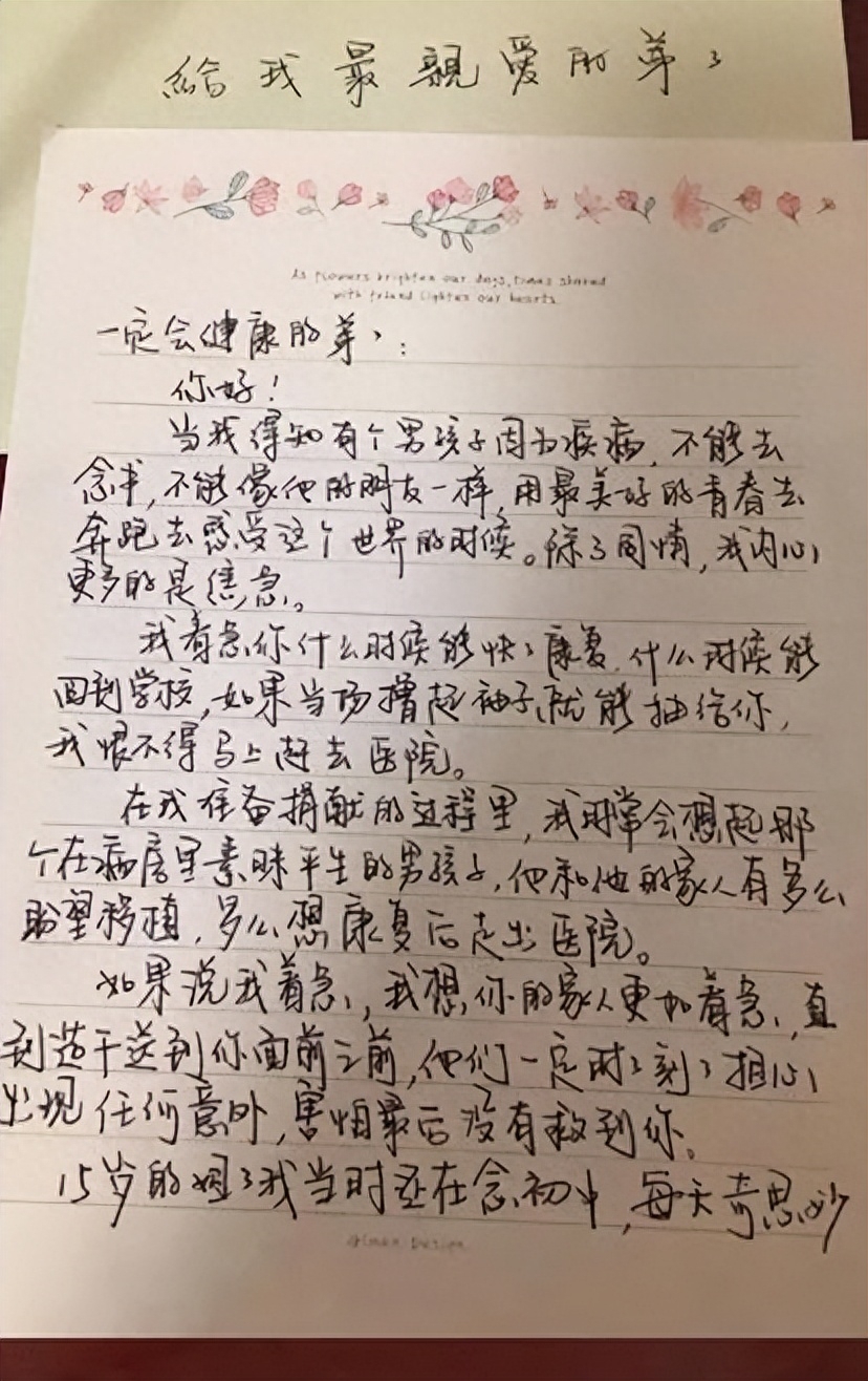 你好,但我得知有個男孩子因為疾病不能去念書,不能像他的朋友一樣用最美好的青春去奔跑,去感受這個世界的時候,除了同情我內心更多的是焦急……不要忘記善待家人,感恩世界,僅(盡)你所能去幫助別人,祝平安健康,一生順利,永遠為你祈禱的姐。」