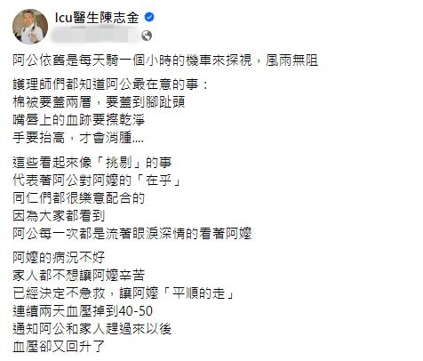 看著阿公每日的堅持,陳志金心想,阿嬤平時一定很注意儀容,當他說完話沒多久,就聽見護理師喊:「陳醫師,停了!(心跳停了)」後來,他才從阿嬤媳婦口中得知,阿嬤出門都一定要梳頭,「這件美事,明年中秋,當阿嬤的家人聚在一起時,一定也會再談起~」